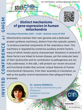 Invited GMGM seminar: Dr Joanna RORBACH (Karolinska Institutet, Sweden) Distinct mechanisms of gene expression in human mitochondria 6 novembre 2025 11h 12h IPCB, Salle des séminaires