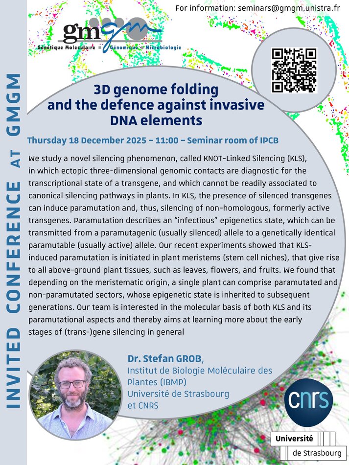 Invited GMGM seminar: Dr Stefan GROB (IBMP, Strasbourg) 3D genome folding and the defence against invasive DNA elements 18 décembre 2025 11h 12h Salle des séminaires, IPCB