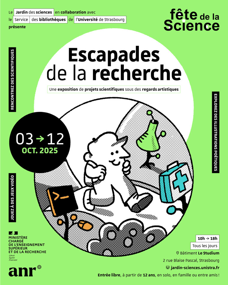 Fête de la Science 2025 a proposé une nouvelle forme de dialogue entre la recherche et la société pour mettre en valeur la beauté (parfois étrange) de la science, sa capacité à stimuler la pensée créative et à changer de perspective sur le monde autours de nous. L'ingrédient clef est l'Art ! Le Jardin des Sciences a réunit ensemble des scientifiques et des artistes afin de catalyser un échange créatif entre eux : les chercheurs ont expliqué leurs projets, tandis que les illustrateurs professionnels s'en sont inspirés pour créer leurs œuvres. Le résultat en est cette exposition magnifique, Escapades de la Recherche, qui a eu lieu au Studium en octobre 2025 !